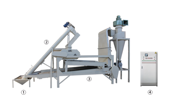 ① 上料斗 ② 絞龍螺旋輸送機 ③ 脫殼、風(fēng)選、分選主機 ④ 電氣控制柜