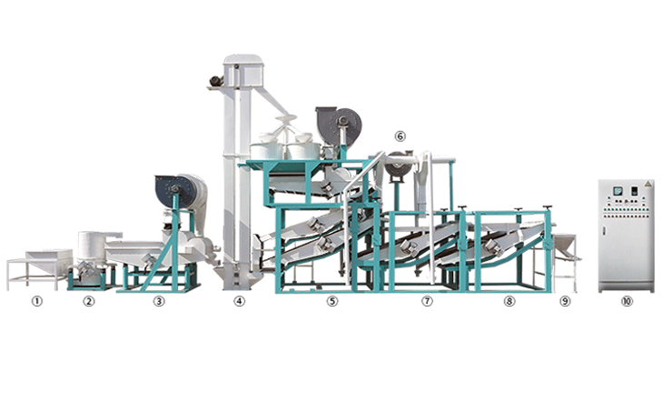 上料斗原料提升機 多功能除雜機 斗式提升機 脫殼、風(fēng)選、分選主機 風(fēng)力回料系統(tǒng) 籽仁復(fù)選機1 籽仁復(fù)選機2 接料斗 電氣控制柜